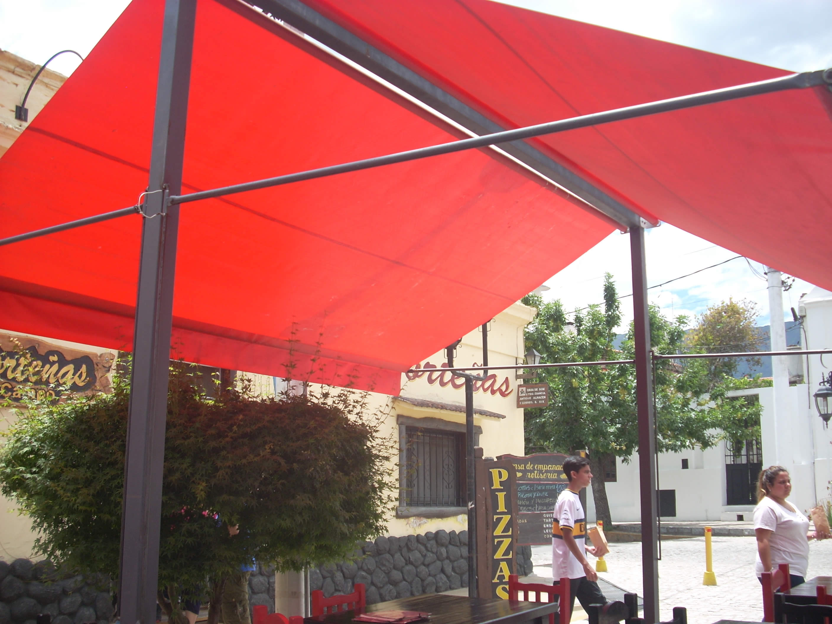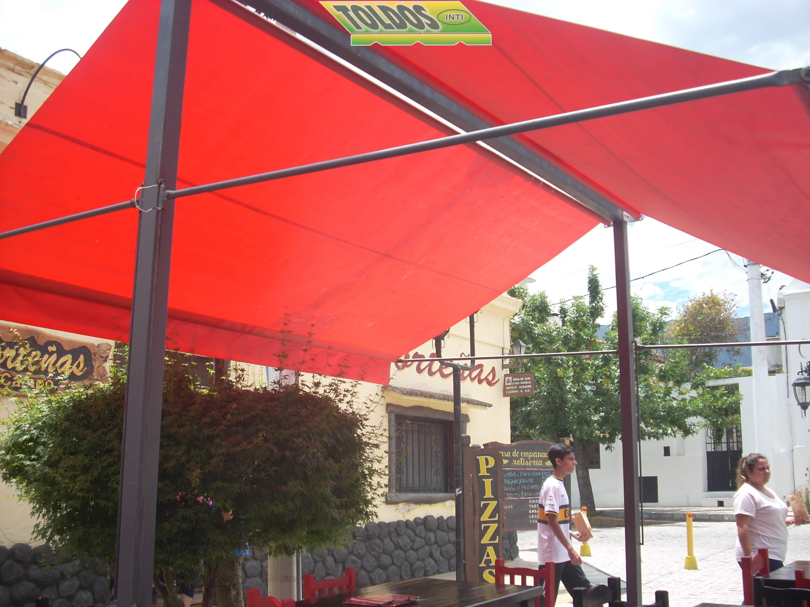 Se adaptan a distintos espacios. Son fabricados de diferentes tamaños y formas. Su armazón se realiza en caño estructural cubiertos con lona de PVC Pampero de alta resistencia o lonas acrílicas nacionales o importadas. En el caso de toldos de uso comercial permiten ser ploteados o impresos con logos o publicidad.