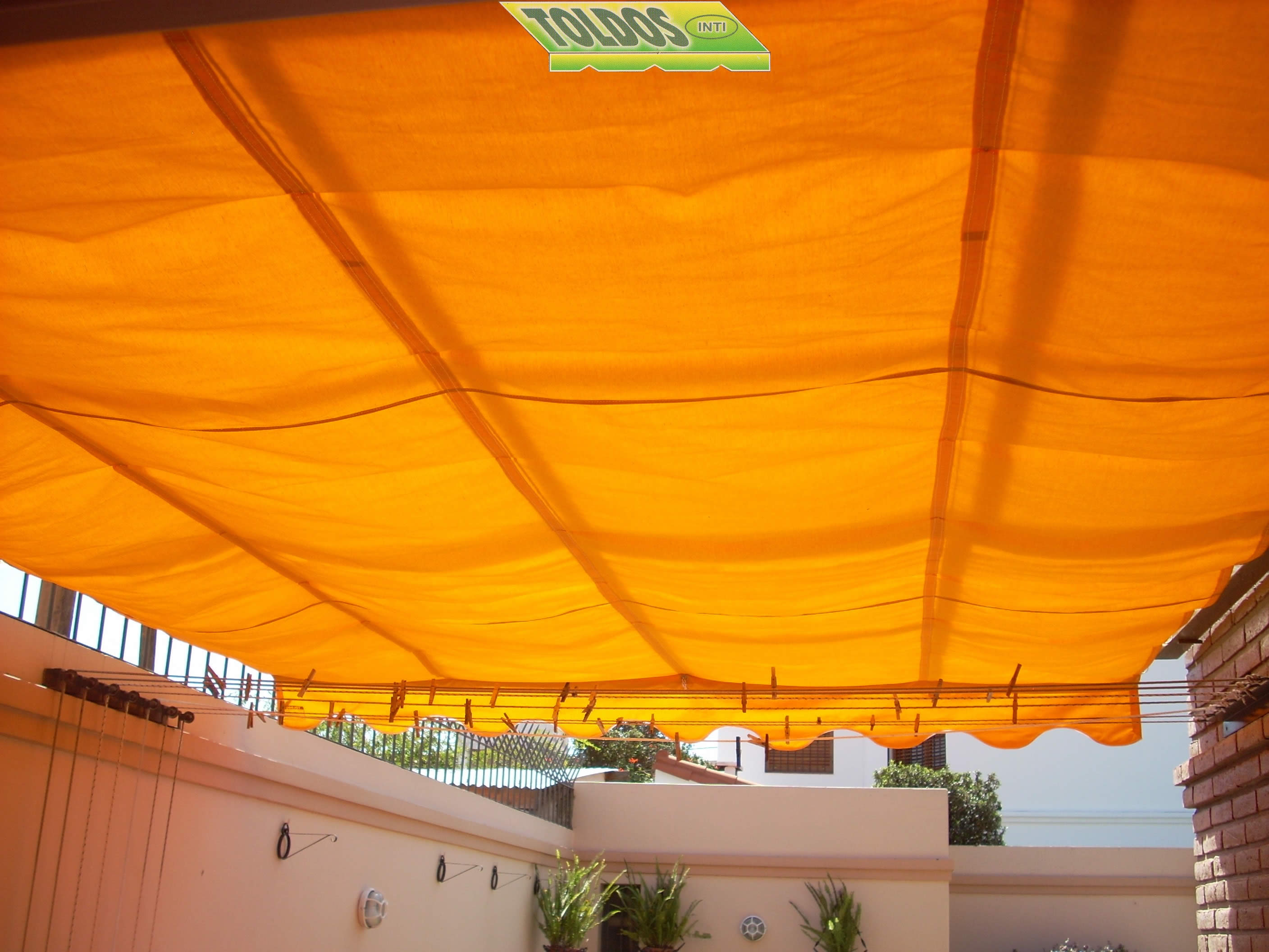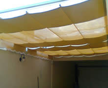 Sistema plegable accionados con soga y roldana ideales para ser instalados en patios internos y pérgolas, pudiendo cubrir grandes superficies. Permiten ser confeccionados en una gran variedad de materiales. Una variedad mejorada de este tipo de toldos es el modelo ROMANO, estéticamente más moderno cuyos pliegues se forman prolijamente con la ayuda de varillas de aluminio.